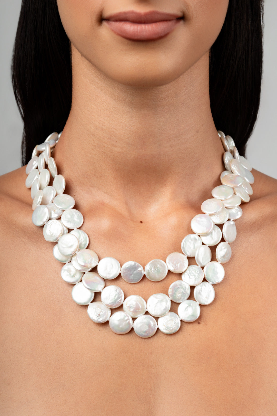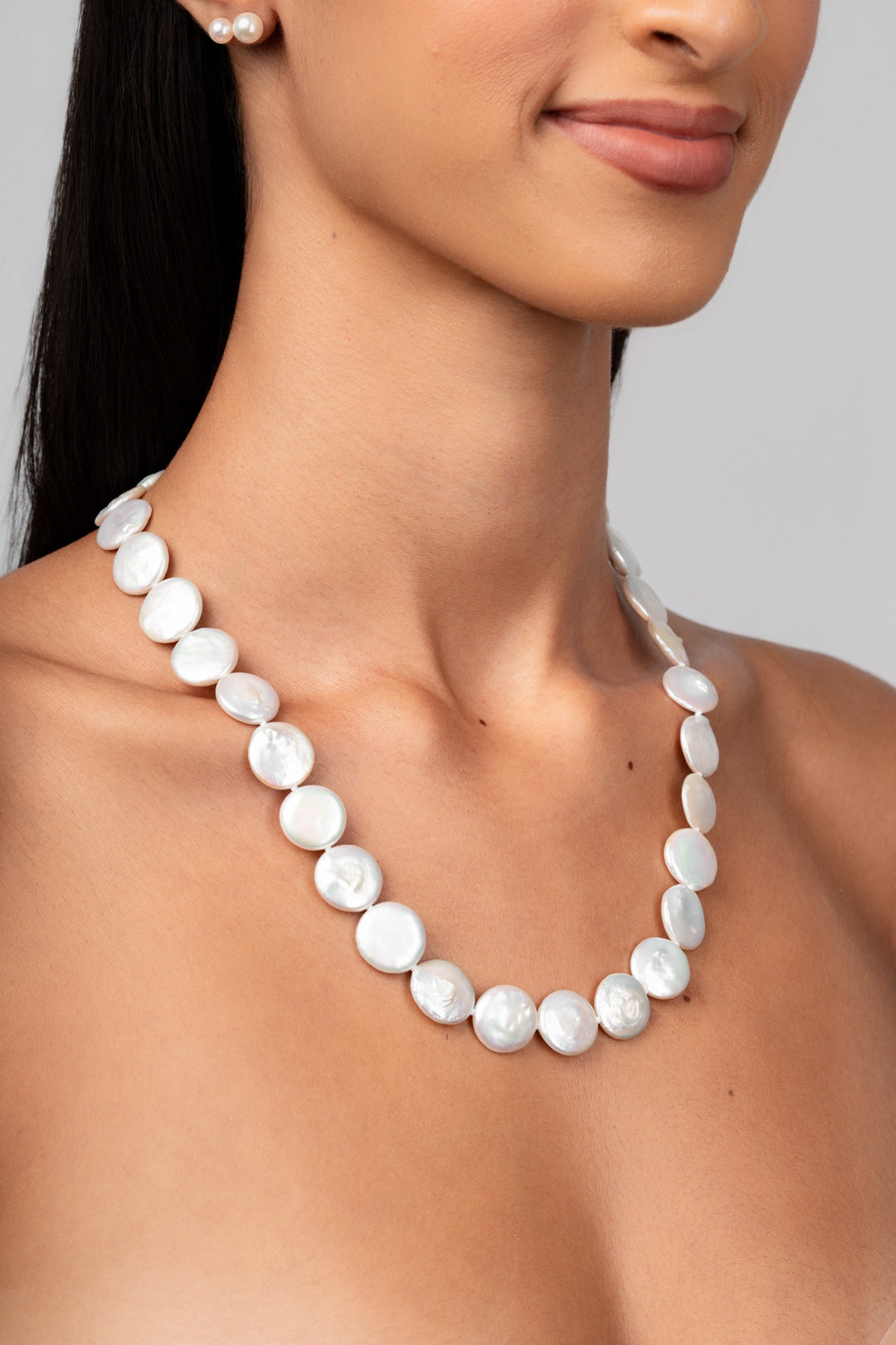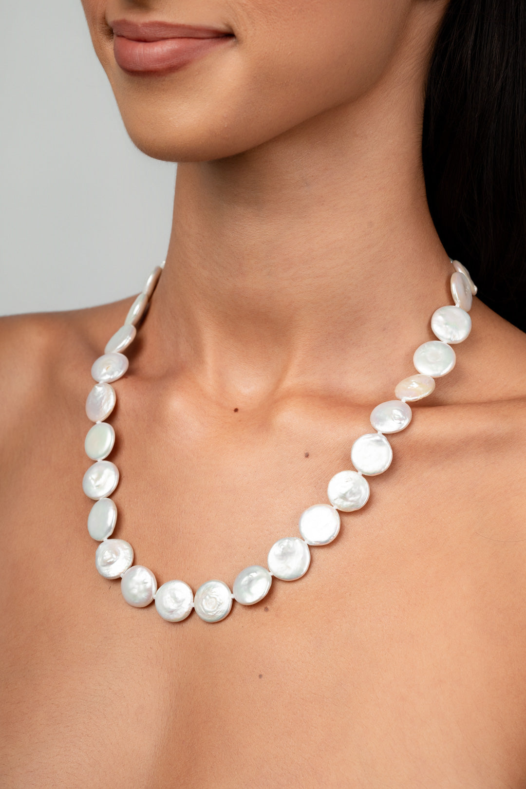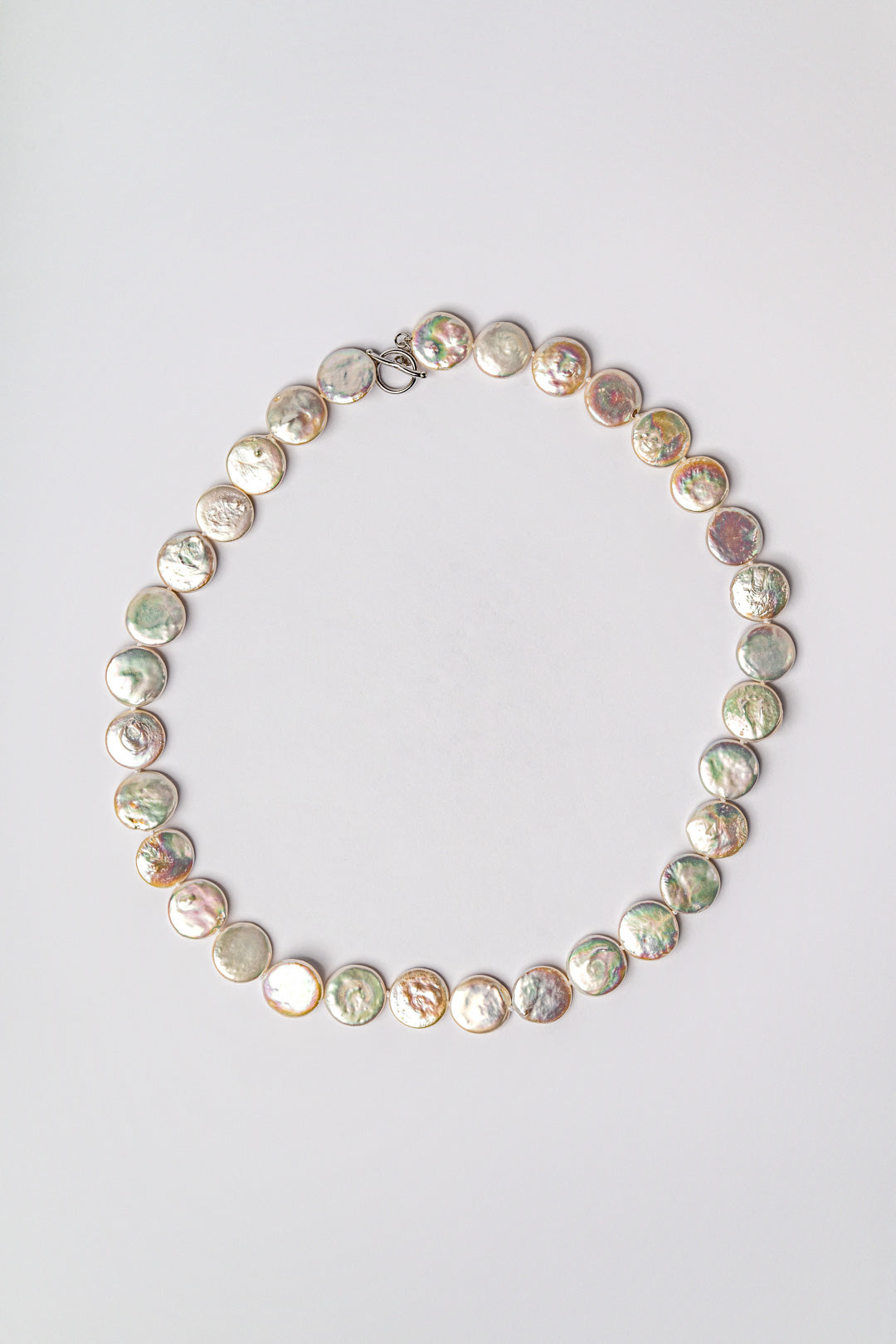 The Constance Necklace features lustrous, white coin pearls, hand-knotted on silk and finished with a sterling silver toggle clasp. The natural shape and soft iridescence of each pearl creates a striking balance of elegance and edge. At 18 inches in length, it sits beautifully along the collarbone — perfect worn alone or stacked for a bold statement.