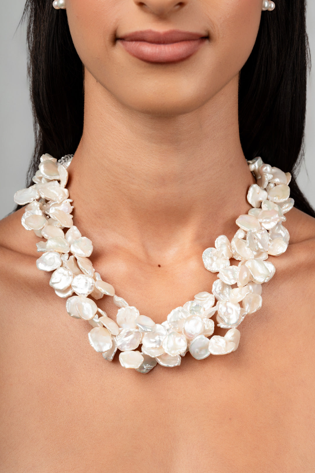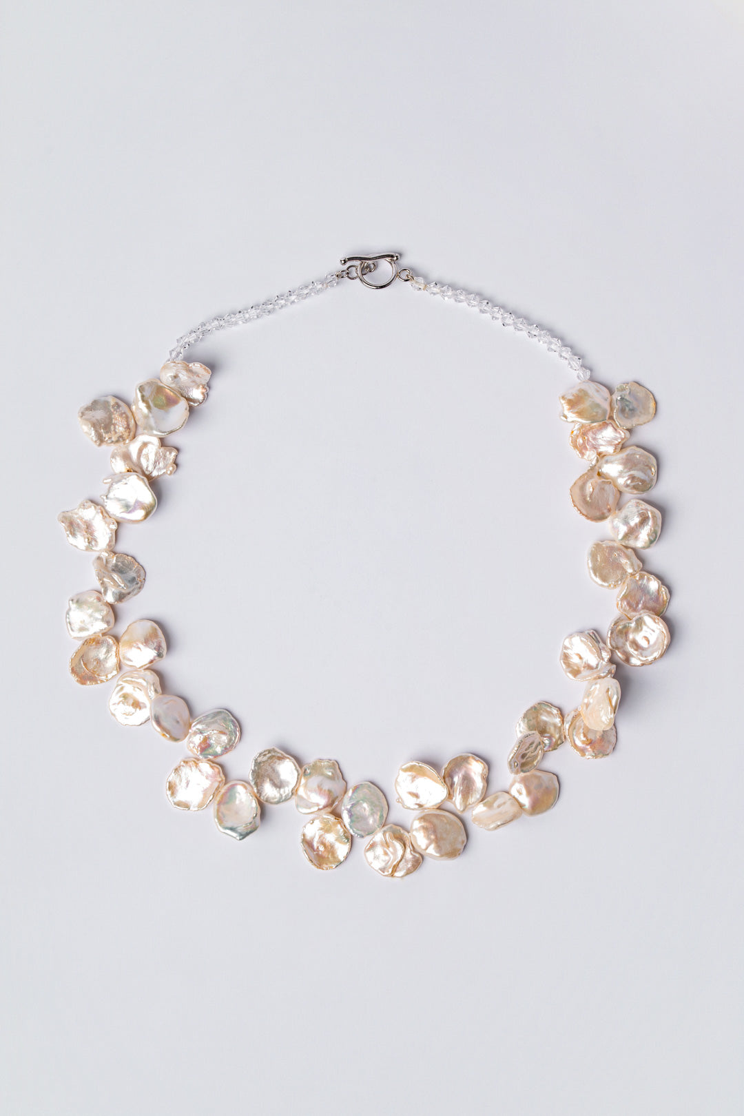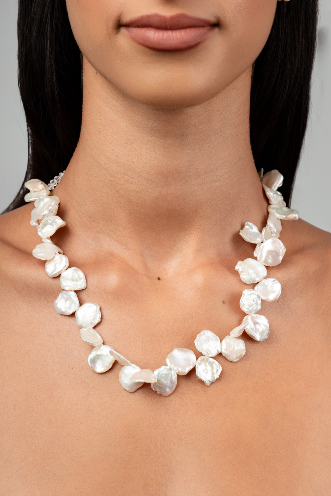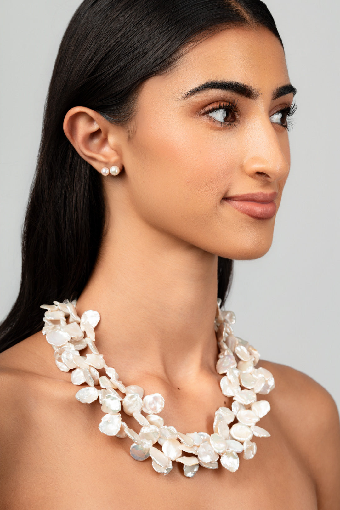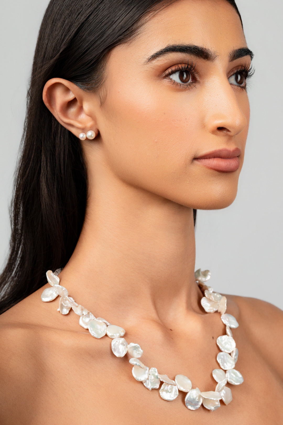 The Meredith Necklace features luminous white keshi pearls, each with naturally unique shapes and a radiant, flawless luster. Hand-knotted with silk thread and finished with a sterling silver toggle clasp, this 20-inch strand is both elegant and striking. Wear it solo for a bold, sculptural statement or stack multiple strands for a look that’s unapologetically glamorous. Every pearl is one of a kind, just like you.